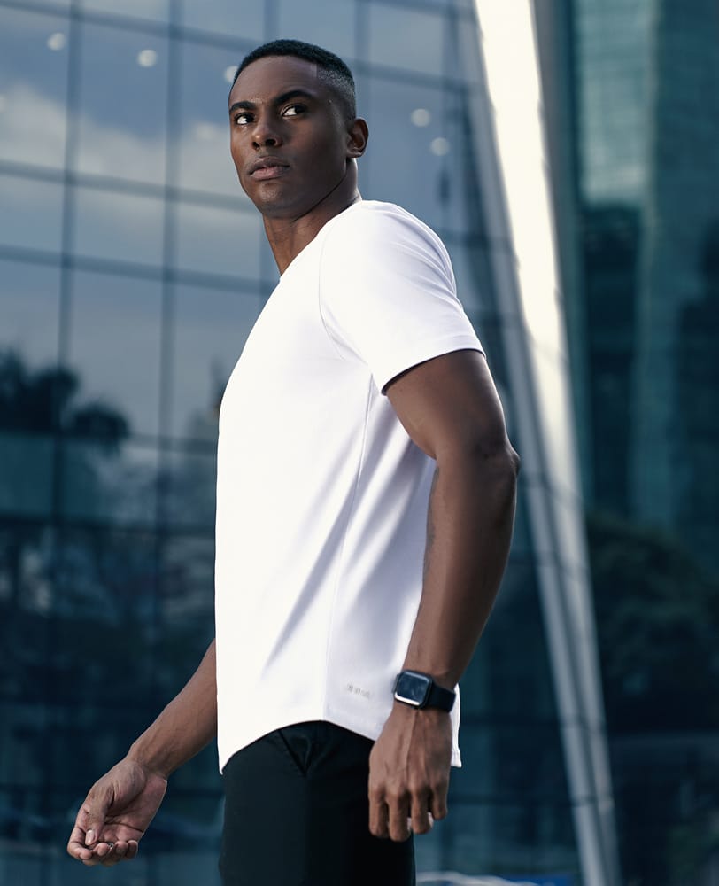 O design curvado, cuidadosamente elaborado, valoriza a silhueta e oferece um ajuste natural que segue as linhas do corpo, criando um visual alongado e moderno. Esse detalhe sofisticado não só diferencia a camiseta, mas também garante que ela se mantenha no lugar, mesmo com movimentos constantes, proporcionando conforto e segurança durante todo o dia.