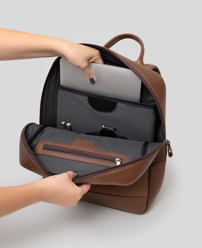 A Mochila Minimal combina elegância e praticidade com seu design sofisticado em couro premium. Com alças em couro e um estilo versátil, é ideal para o uso urbano e eventos. Seu compartimento para notebook de até 15.6 polegadas garante segurança e organização para seus equipamentos. Além disso, a mochila possui um engate inteligente que facilita o transporte em viagens, permitindo que ela seja acoplada à sua mala.
